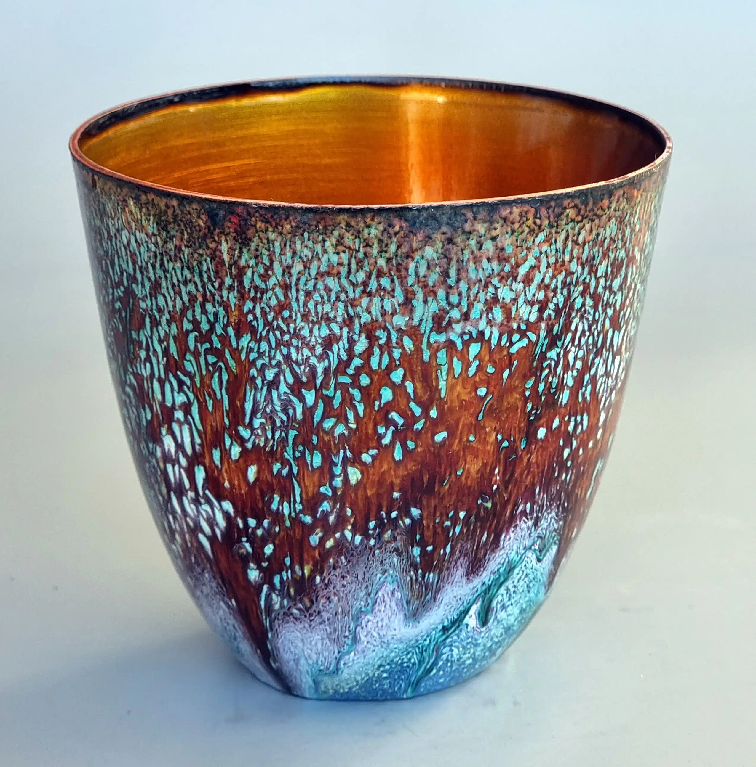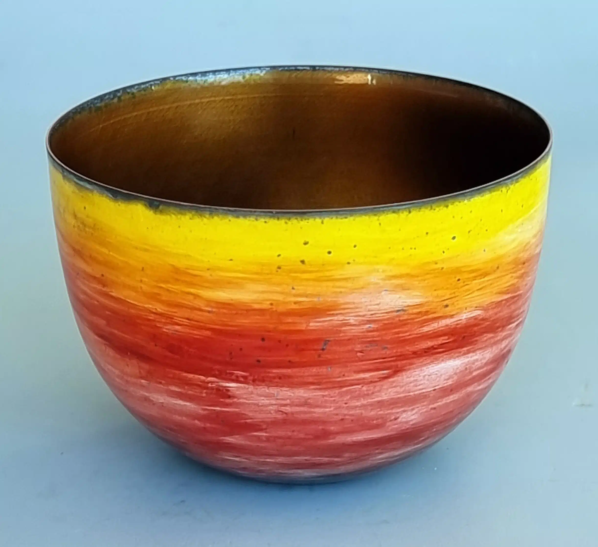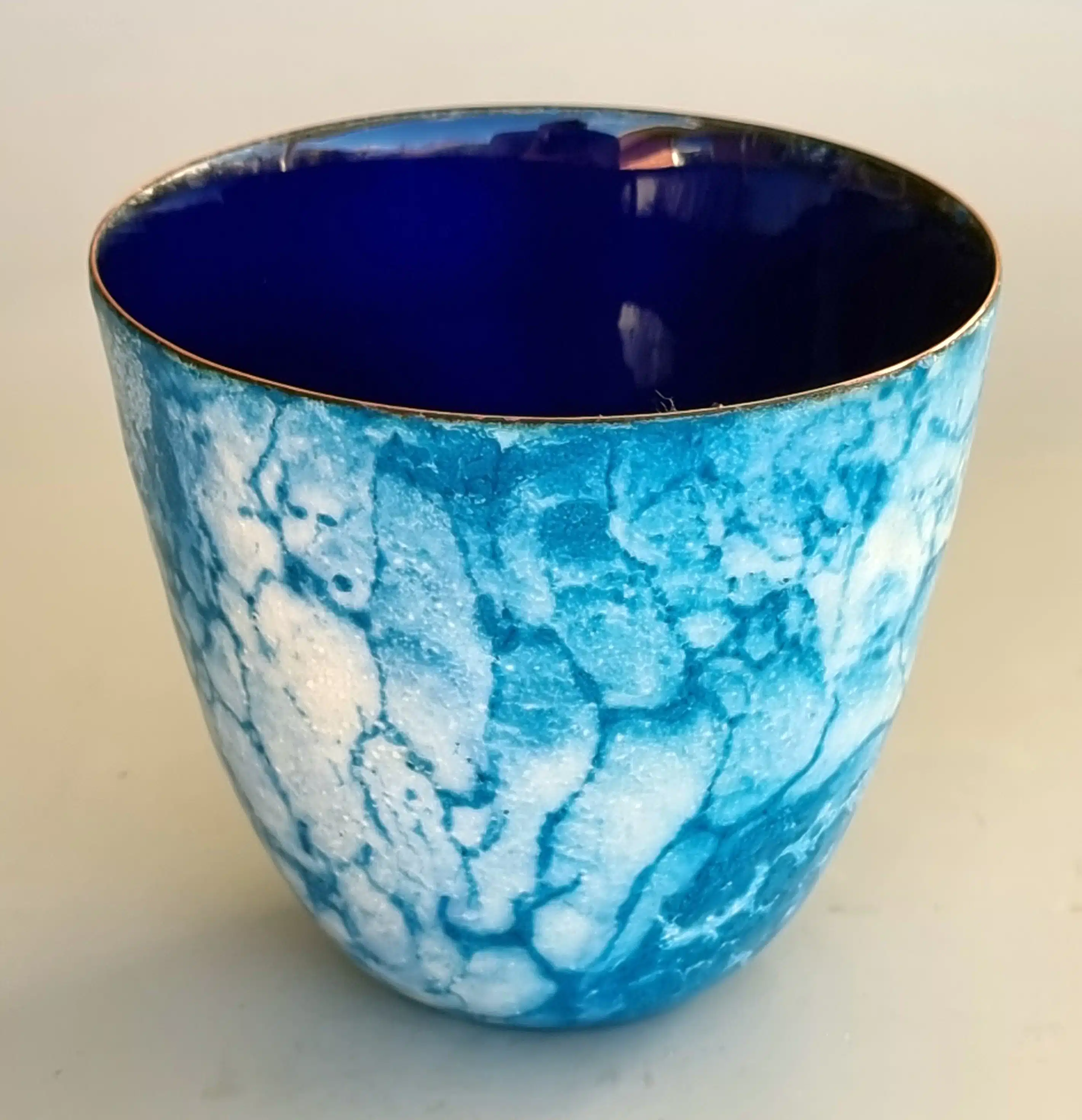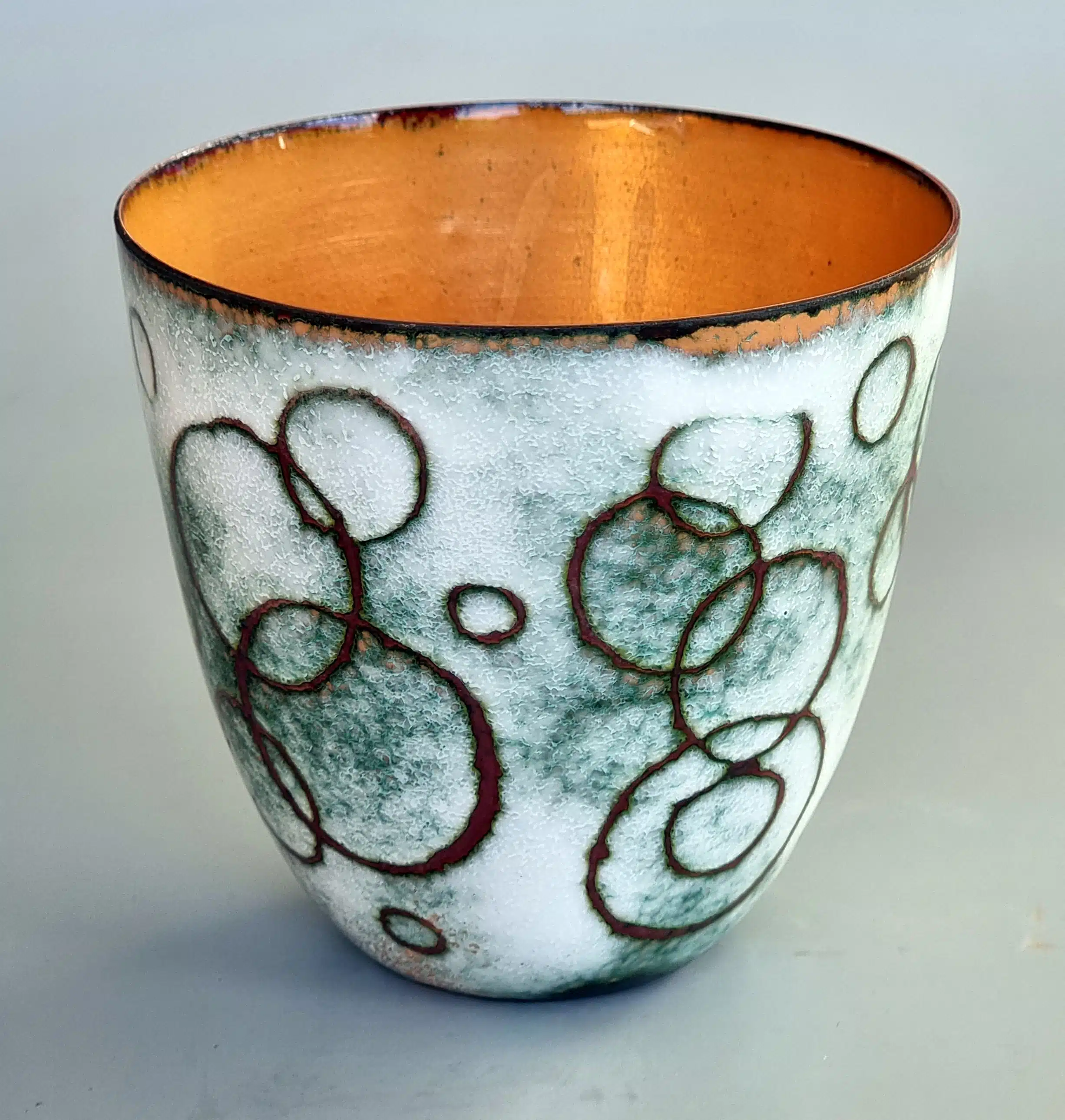 Mine designs er ofte inspireret af Art Nouveau eller geometriske mønstre, ofte med en gravering i sølvet, der øger lysreflektionen i den transparente emalje. Gennem mit medlemskab af Guild of Enamellers (emaljelaug) i England blev det åbenlyst for mig, hvor mange muligheder emalje har. Brænding af emalje på kobber ved ekstra høj temperatur og i ekstra lang tid giver overraskende resultater og effekter, som kan ses på mine bægre og skåle.