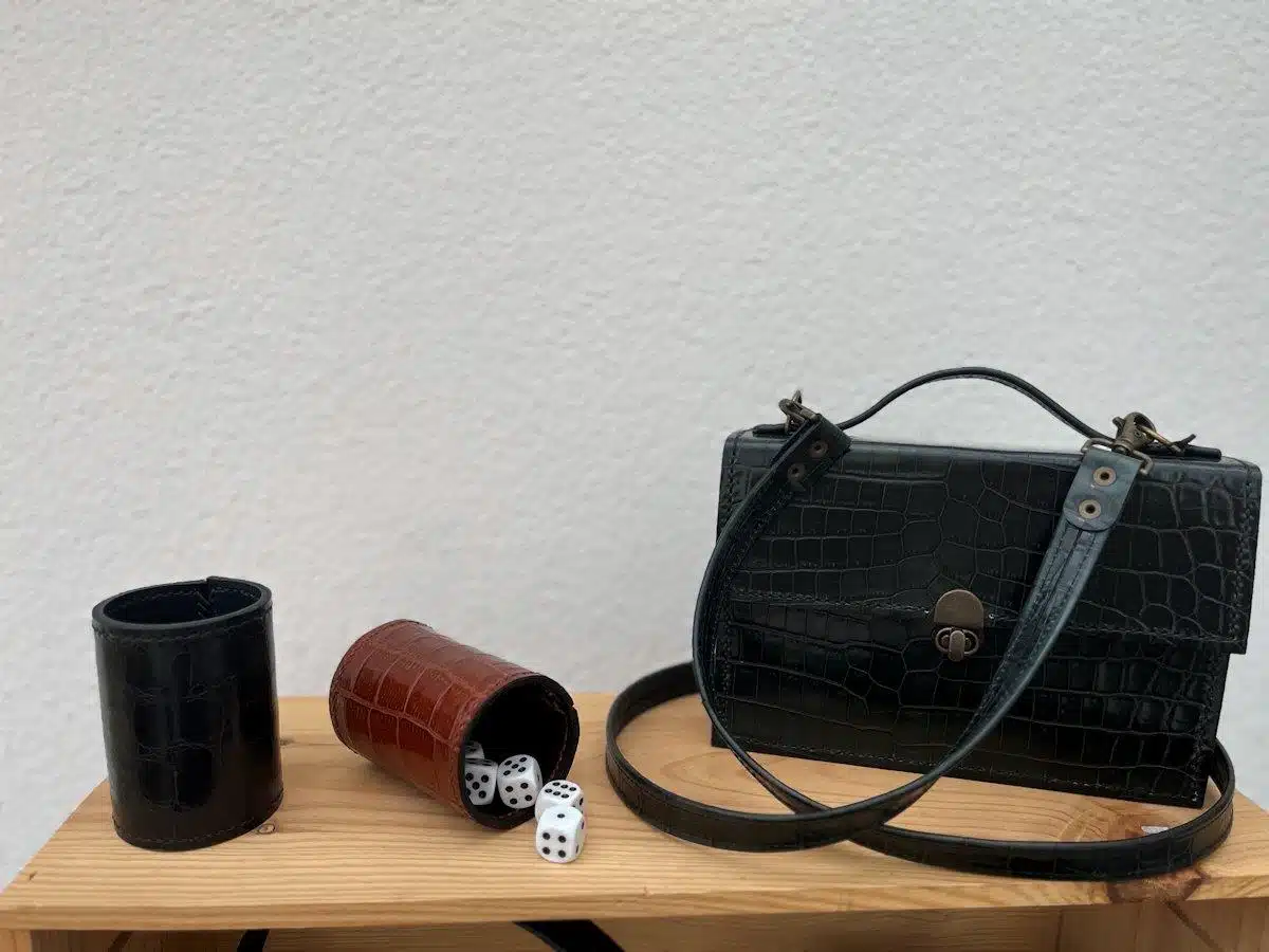 Alle mine lædervarer designer og producerer jeg selv. Taskerne består af to lag skind – udvendigt er der præget kalveskind og indvendigt består de af indfarvet kernelæder, som jeg selv indfarver. Kernelæderet er skåret sådan, at taskerne kan folde, hvor jeg gerne vil have dem til det. De to lag er limet og håndsyet sammen. Til sidst monterer jeg lukninger og hank på taskerne. Taskerne er små og hårde og formerne er enkle. Jeg laver også en del småting i læder: Bælter, punge, raflebæger mm. De seneste år har jeg også arbejdet i genbrugstekstiler. Jeg syr muleposer,