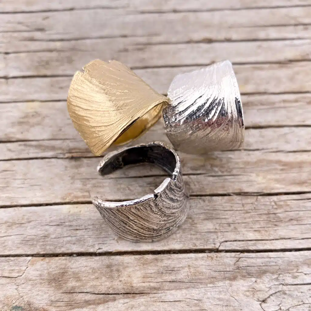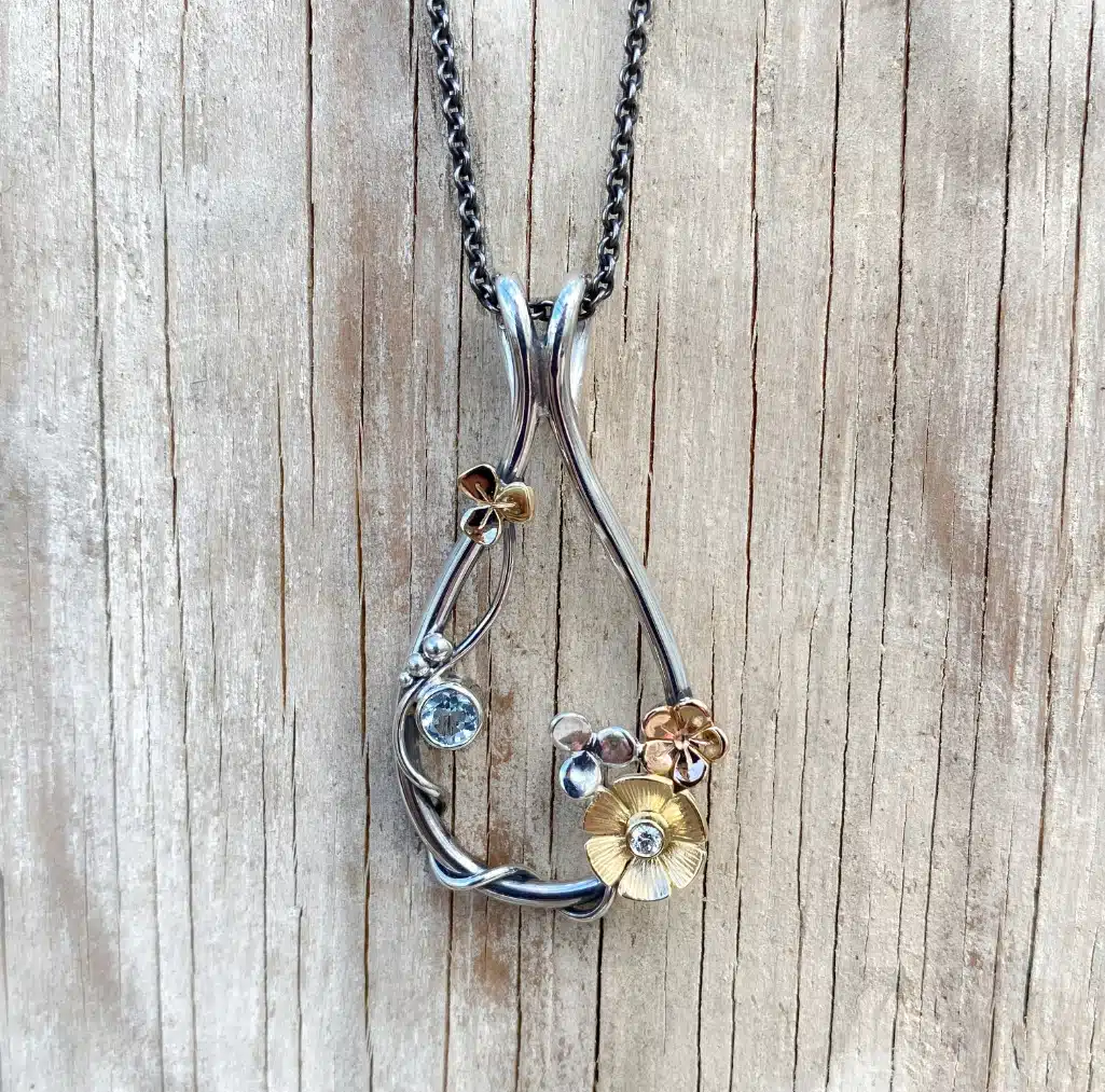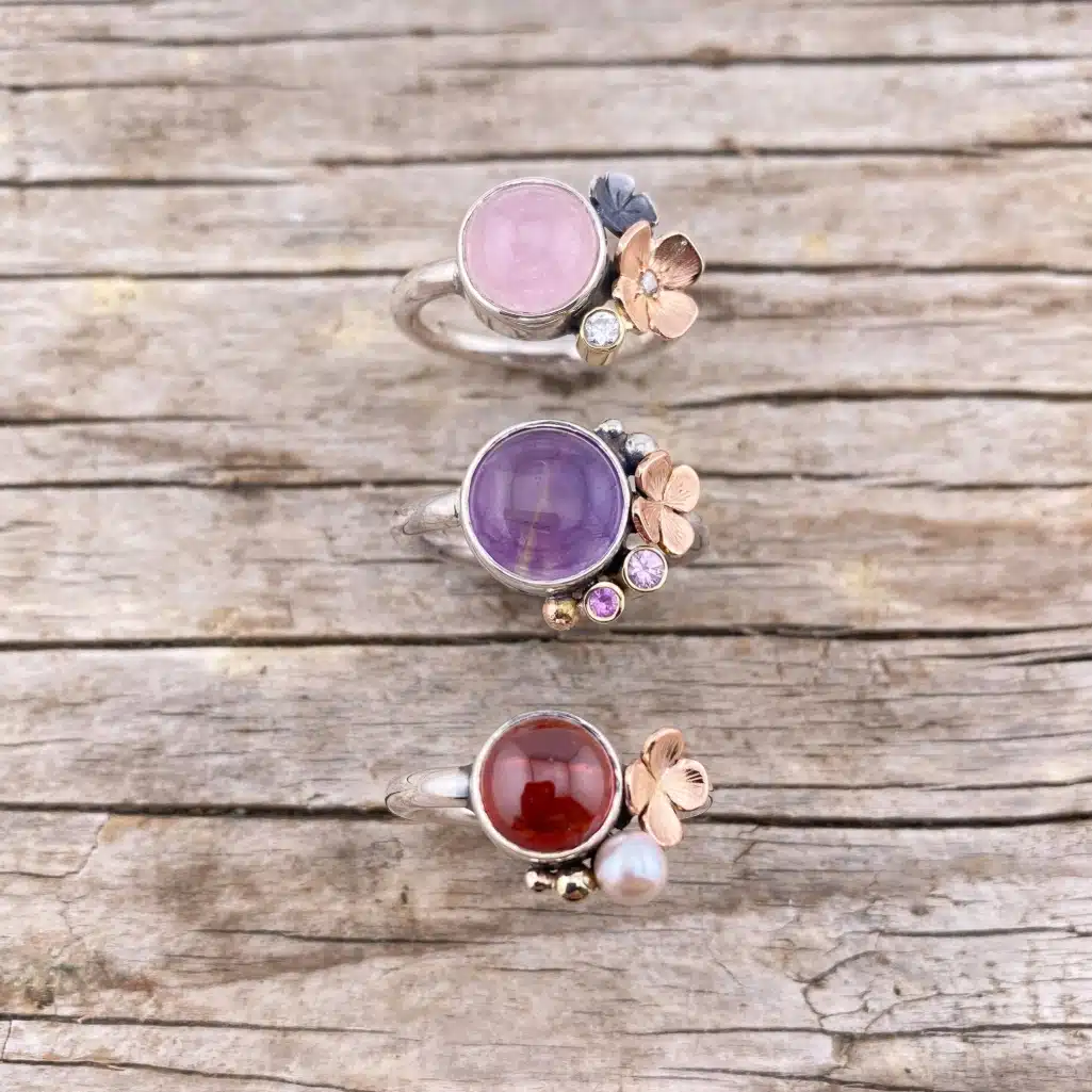 Idéerne til mine Smykker opstår ofte intuitivt når metallet rammer hænderne. En tråd der snor sig, en blomst der tilfældigt titter frem, små sten der glimter i skyggen. Som processen skrider frem, opstår der sød musik imellem elementerne, og det færdige smykke er fyldt med Omhu og Kærlighed. Jeg finder oftest min Inspiration i Naturen, og elsker at kombinere forskellige metaller.