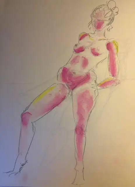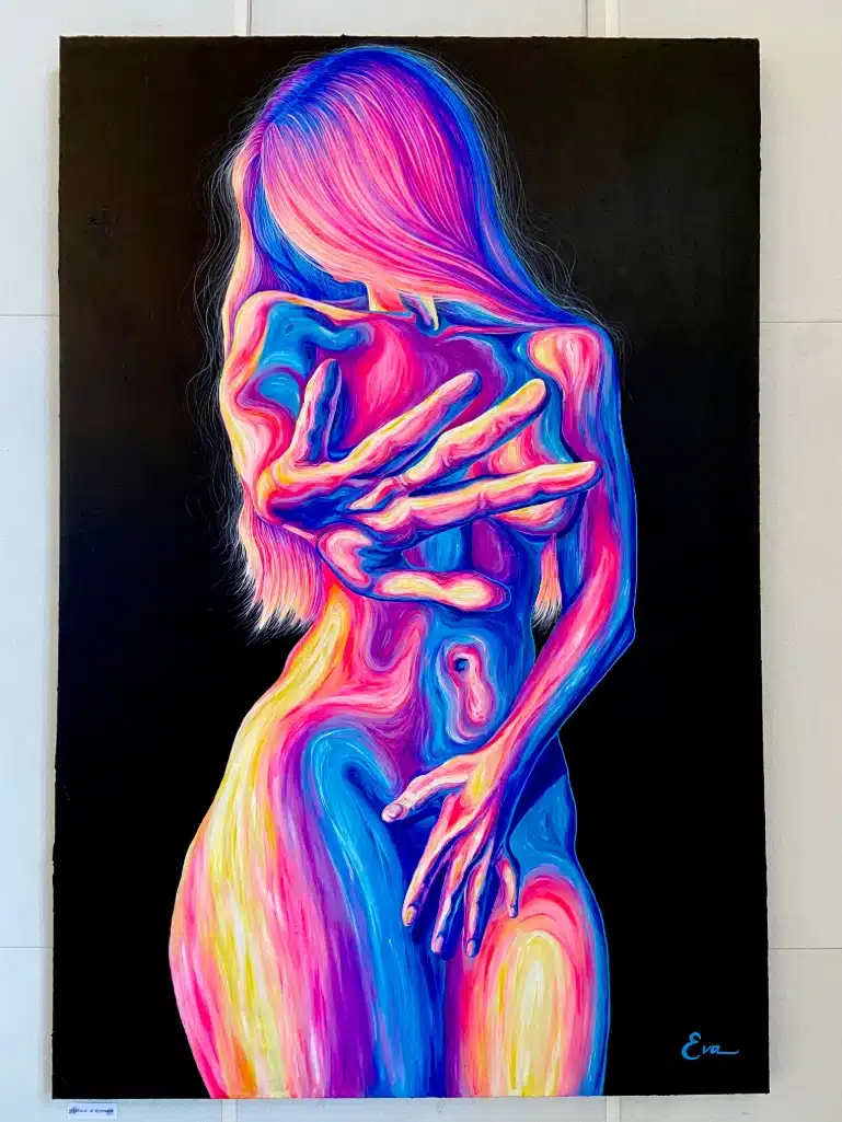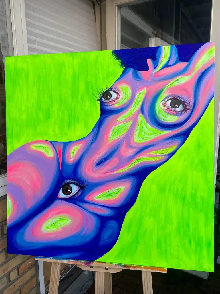 Jeg er dybt inspireret af kvinder, hvordan det føles at være kvinde, og hvordan man vurderes som kvinde. Min akademiske forskning har fokuseret på ‘the male gaze,’ en feministisk teori, som beskriver, hvordan kvinder objektiviseres og seksualiseres i medierne og ofte reduceres til passive legemliggørelser af den mandlige fantasi. Mit arbejde søger at tage dette blik tilbage og vende magten til kvinden- at gøre hende til iagttageren, drivkraften, subjektet frem for objektet. Mine malerier er levende, dynamiske og farverige. De rummer en rå energi og afspejler den indre kamp mellem kvindelighed, kroppen og verden. Min kunst handler ikke bare om at blive betragtet – den ser tilbage, udfordrer, og kræver sin plads.