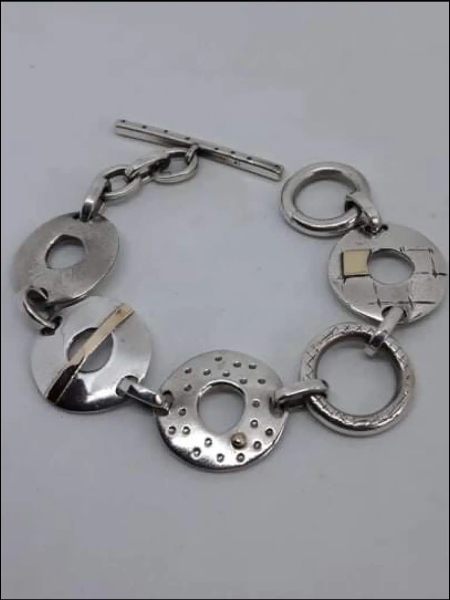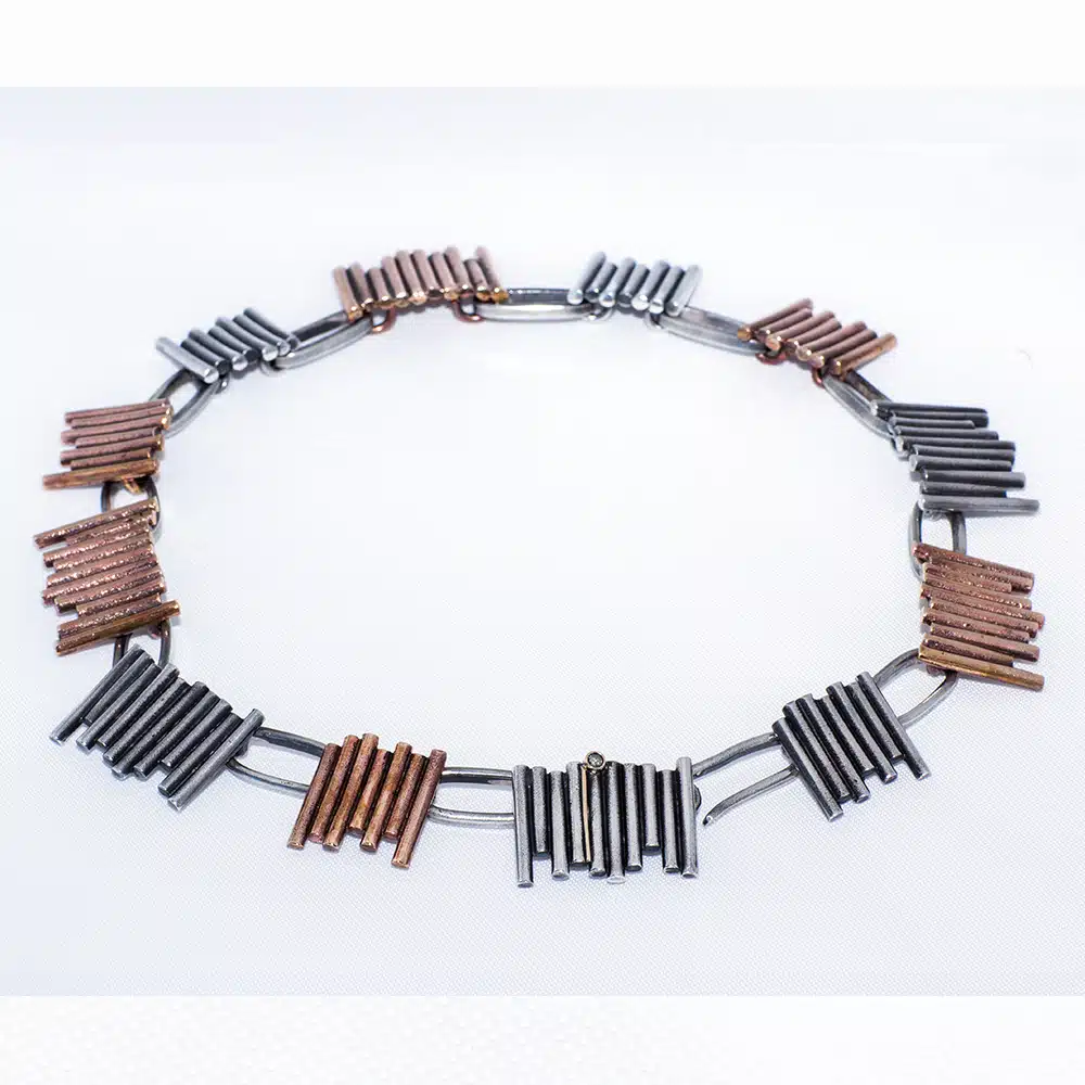 Jeg foretrækker enkeltheden, og arbejder meget med overfladerne. Overfladernes farve og struktur sammen med diverse stene er med til at give liv til smykkerne. Jeg arbejder fortrinsvis i sølv, guld og bronze. Gummi og brillanter er ofte kombineret med de forskellige metaller. Groft og fint sammen. Det maskuline med det feminine.